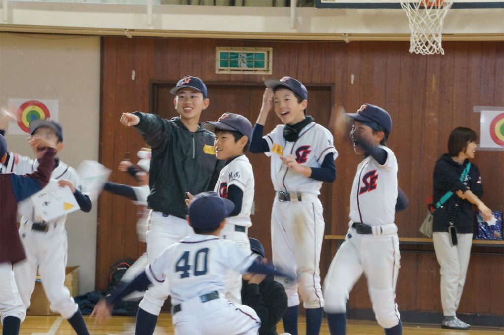 ぞうきんがけレースなど身体を使ったゲームから、コーチの愛用品を当てるクイズまで、1年生から6年生まで、チームで協力して勝利を目指します。