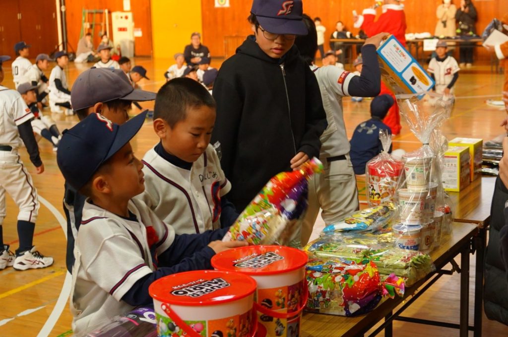 くじ引きによるプレゼントは、お菓子から実用的なものまでいろいろ。